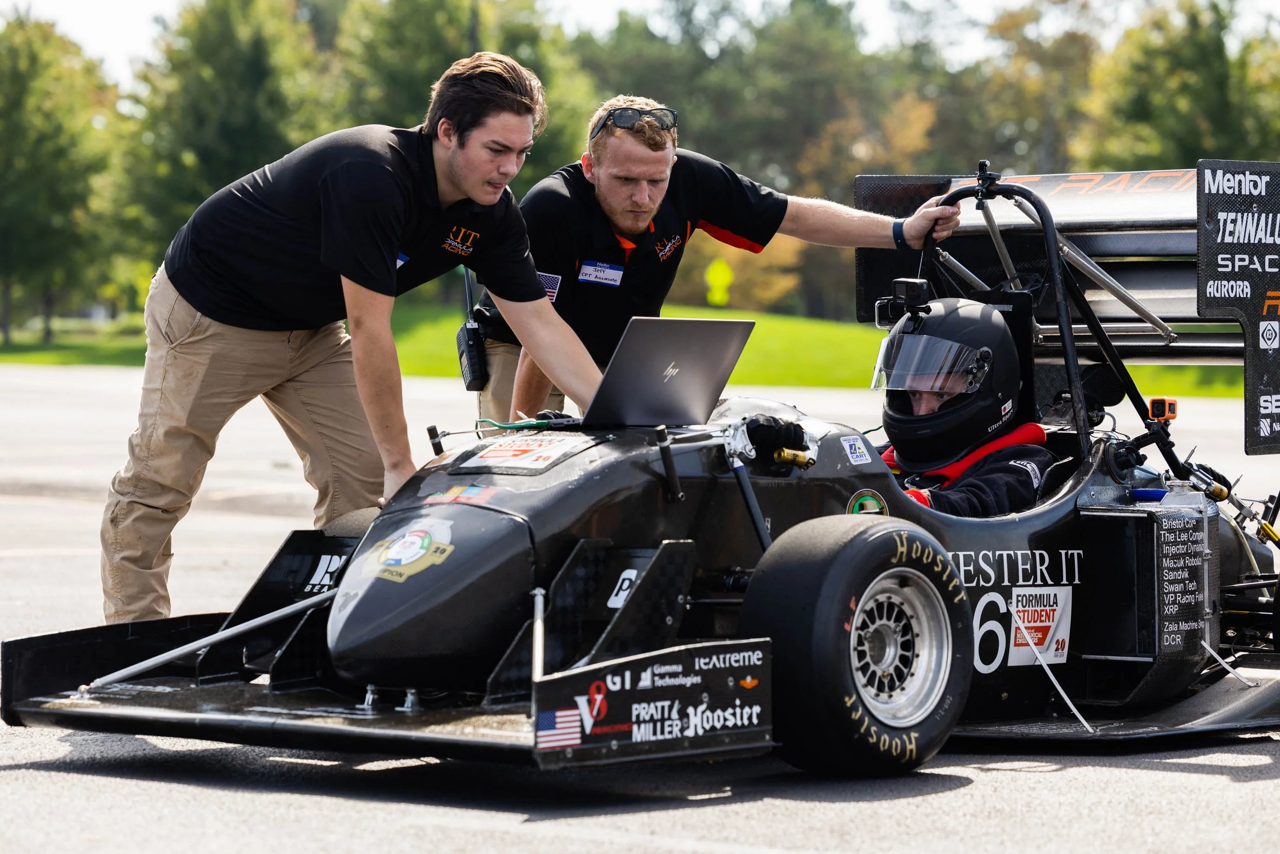 The RIT Racing Team’s CPT (Combustion Power Train) Lead Nick Morlock, left, CPT Associate Jeff Bingham, center, and Aerodynamics Lead and driver Sebastian Steigerwald attempt to diagnose the engine overheating during the team’s New Members Day at RIT in Rochester, N.Y. on Sept. 10, 2022. Morlock and Bingham were able to look directly at the car’s data to find out if the engine would be able to start again. It was later determined that the water pump had failed and caused the overheating.