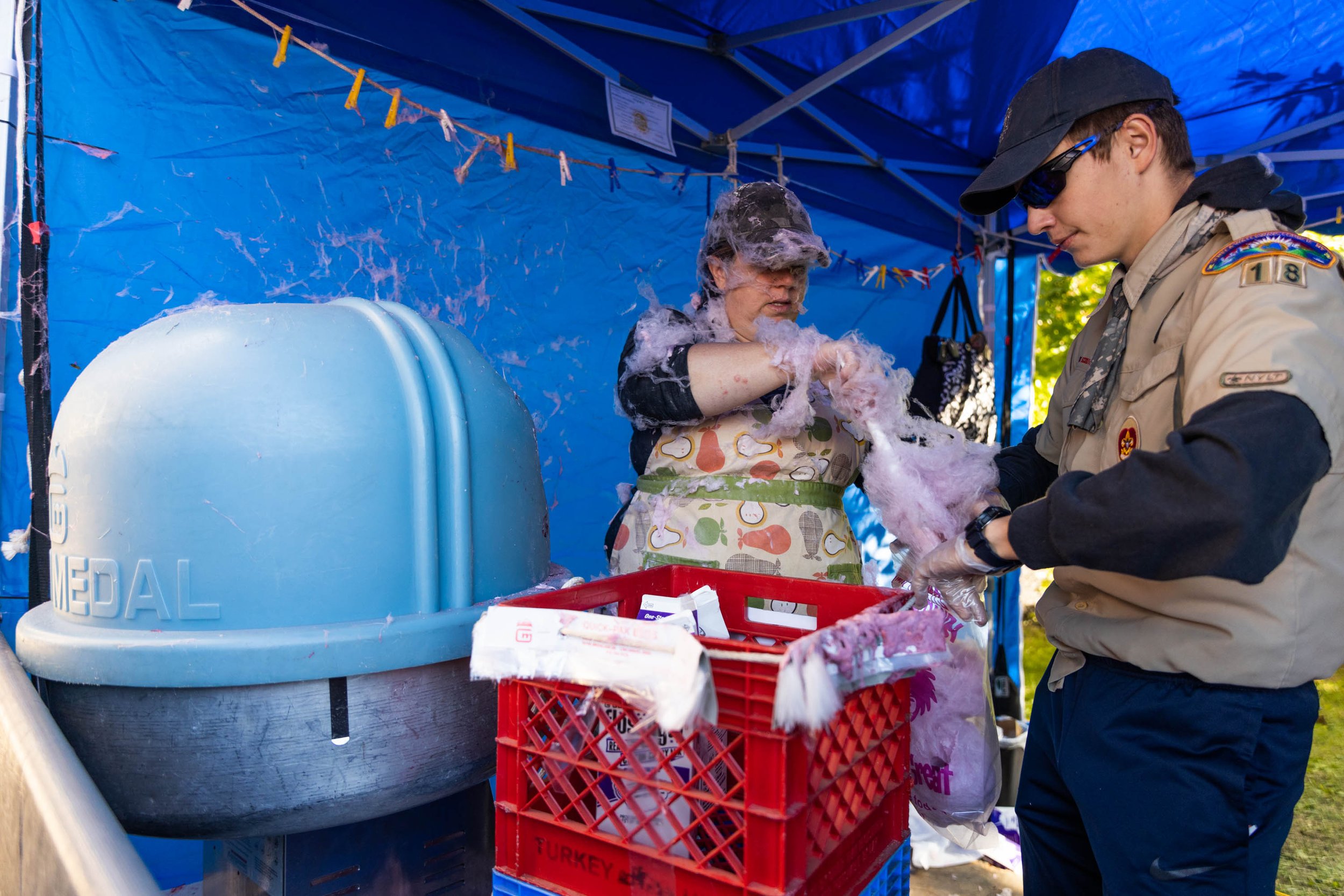 Members of Boy Scout Troop 18 Will G., right, and volunteer Tracy K. who got covered in cotton candy after a long day of preparing it, sell cotton candy at Hilton Apple Fest in Hilton, N.Y. on October 2, 2022. All of the money from their sales go towards the Troops supplies for camping and awards ceremonies.
